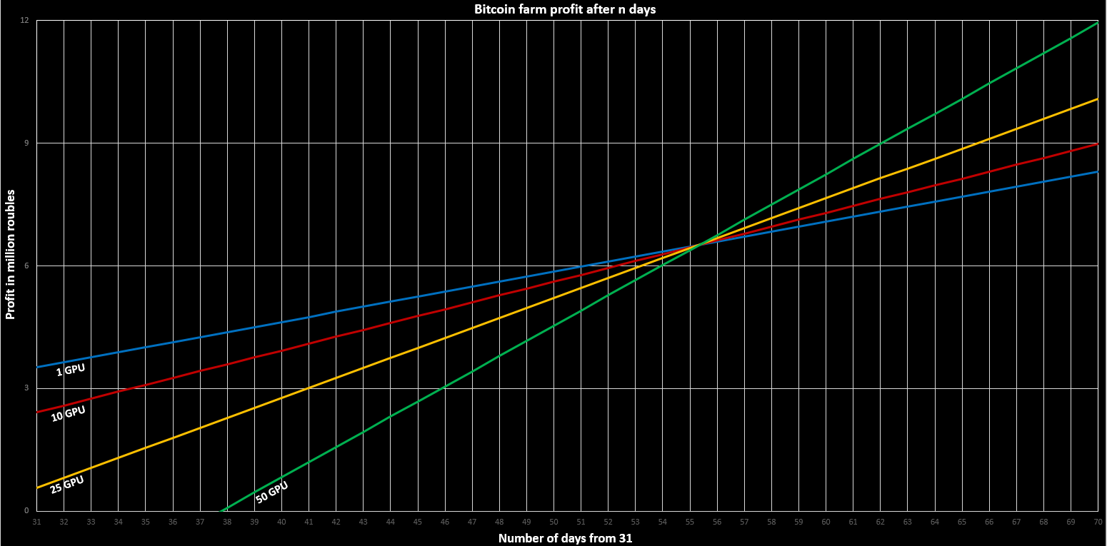 Eft Bitcoin Farm Time Chart: With each additional card, the production time per bitcoin goes down, but it's not quite linear.